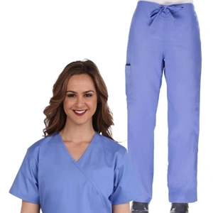 Clearance Women’s Mock Wrap Scrub Top & Cargo Scrub Pant Set, Ceil Blue, S