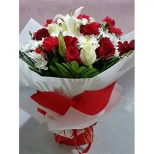 White Lily And Red Roses Hand Bouquet With Red And White Wrapping